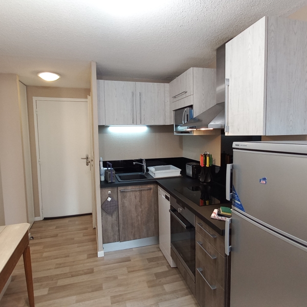 Cuisine entièrement équipée avec : frigo-congélateur, lave-vaisselle, four électrique, four micro-ondes, hotte, lave-linge , 3 plaques induction